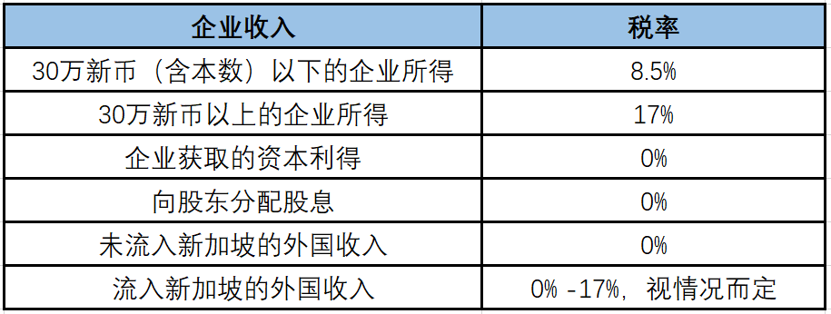 ⑵新加坡的企业所得税税率上限为17%。因为采用极具竞争力的企业所得税税率,新加坡多年来持续吸引大量外国投资者前来淘金。新加坡采用一级企业税收制度,即本地企业为其所得收入缴纳税款后再向股东派发股息,此时股东无需为这笔股息缴纳个人所得税。