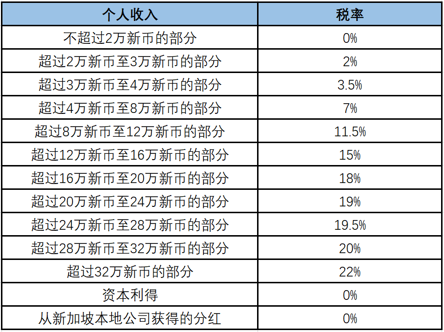 ⑶对于新加坡的税务居民而言,个人所得税税率最低为0%,最高为22%;对于非新加坡税务居民而言,个人所得税税率为15%-22%。
